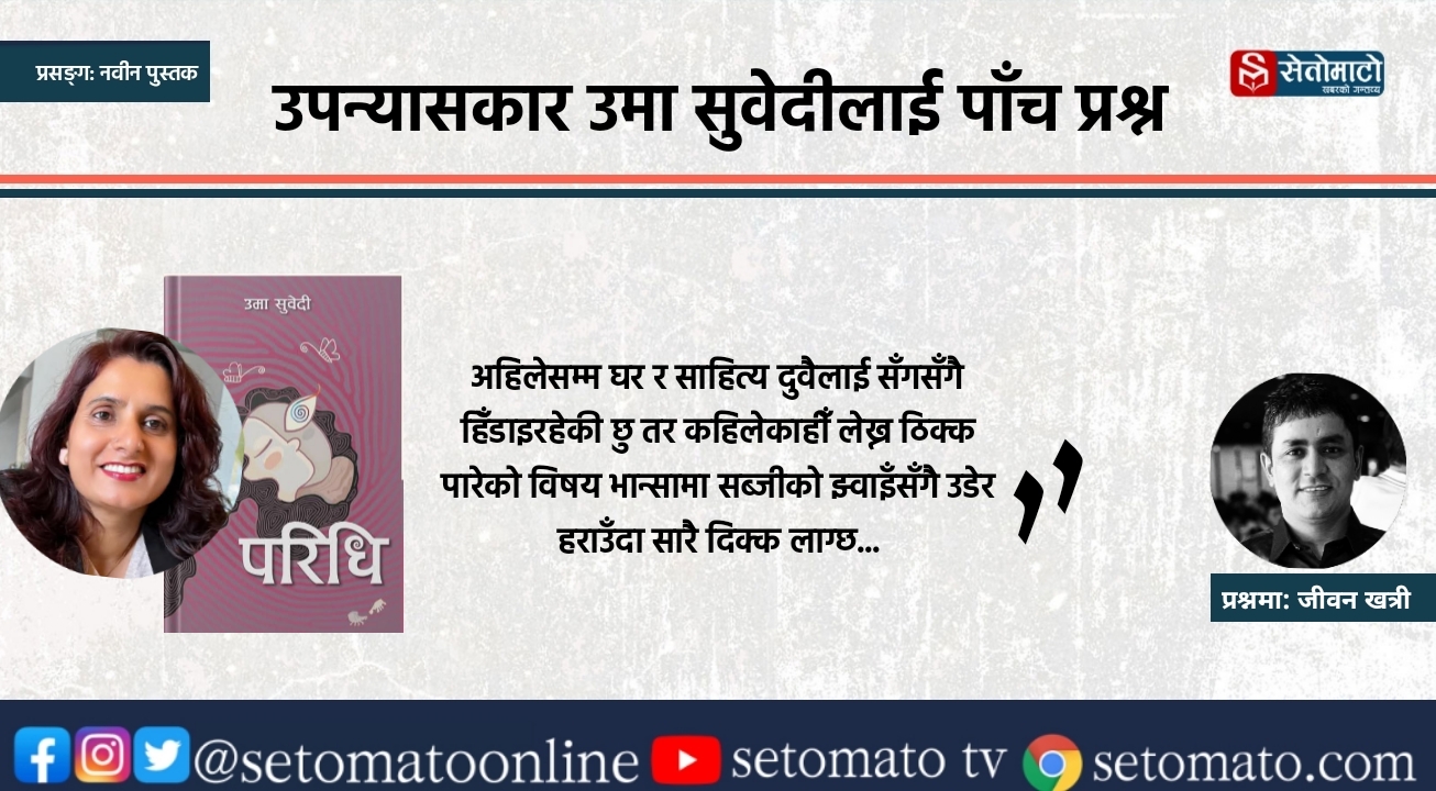 उमा सुवेदी नेपाली साहित्यमा चिनाईरहनु पर्ने नाम हैन् । एक दशक अघि तोदा उपन्यास लिएर आएकी उनलाई उक्त उपन्यासले साहित्यमा शसक्त परिचय दिलायो । इति, सयौँ पुतली उनका शसक्त आख्यान कृति हुन् । कुनै पनि विषयलाई गम्भिर चेत र नवीन शैलीका साथ पस्किने उनको पछिल्लो उपन्यास परिधि हो । यसै परिधिको सेरेफेरोमा रहेर सम्पादक जीवन खत्रीले सुवेदीसँग गरेका पाँच प्रश्न र उनको जवाफ;
