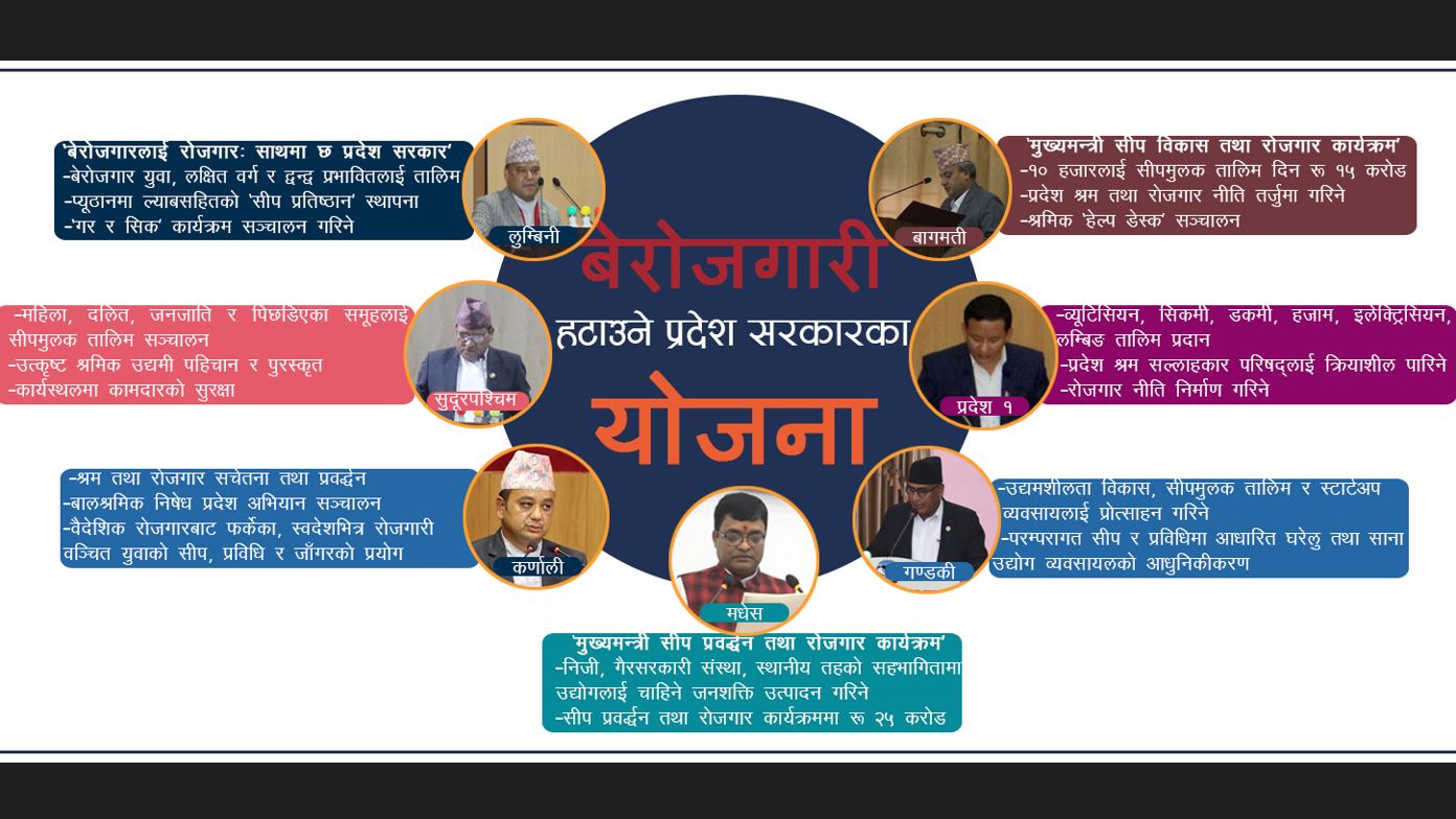 बागमती प्रदेश सरकारले १० हजार युवालाई स्वदेशमै काम गर्न सक्ने गरी स्वरोजगारमूलक सीप सिकाउन ‘मुख्यमन्त्री सीप विकास तथा रोजगार कार्यक्रम’ सञ्चालन गर्ने घोषणा गरेको छ । सो कार्यक्रममा प्रदेशभित्रका गरिब, विपन्न र द्वन्द्वपीडित परिवारका व्यक्तिलाई सीपमूलक तालिममा प्राथमिकता दिइने छ ।