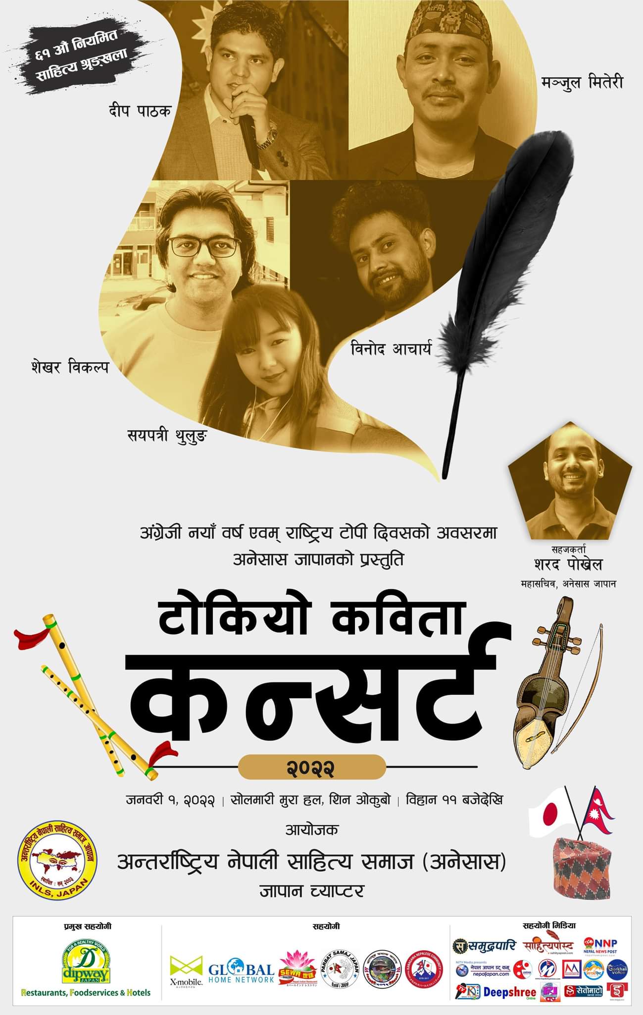 टोकियो जापान – अनेसास जापानले नयाँ वर्ष २०२२ तथा राष्ट्रिय पोशाक दिवस जनवरी १ को अवसर पारेर आयोजना गर्न थालिएको ‘टोकियो कविता कन्सर्ट २०२२’ तथा ६१ औँ नियमित साहित्य शृङ्खलाको सम्पूर्ण तयरी सकिएको जानकारी दिएको छ।