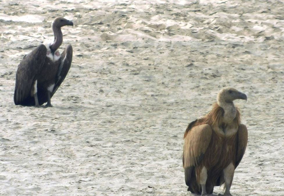 शुक्लाफाँटा राष्ट्रिय निकुञ्जको सनवोरा नदीको बगरमा देखा परेका कालो र खैरा हिमाली डंगर गिद्ध । गिद्ध संरक्षणमा जोड दिइन थालेपछि सङ्ख्यामा वृद्धि हुन थालेको छ ।