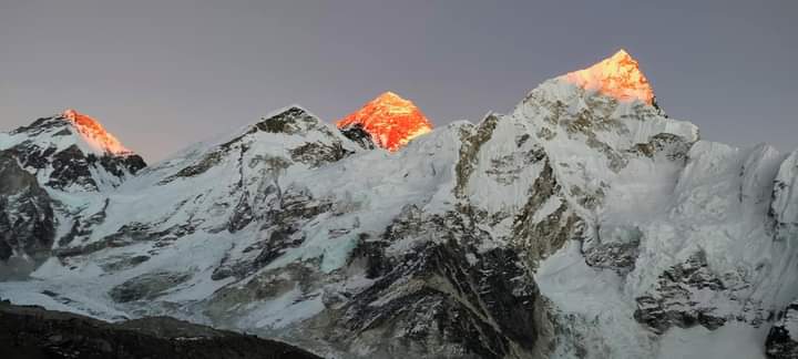 कालापत्थर – सगरमाथा र अन्य हिमालका चुचुराहरूको साँझको दृश्य । घाम अस्ताउने समयमा सगरमाथाको दृश्य सुनको टोपी लगाएको जस्तै देखिन्छ ।
