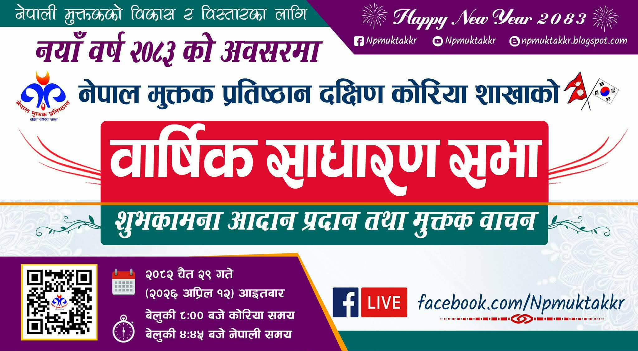 सउल दक्षिण कोरिया – नेपाल मुक्तक प्रतिष्ठान दक्षिण कोरियाको सातौँ वार्षिक साधारणसभा, नववर्ष २०८३ सालको अवसरमा शुभकामना आदानप्रदान तथा रचना वाचन कार्यक्रम २०२६ अप्रिल १२ (२०८२ चैत अन्तिम) का दिन भर्चुअल माध्यम जुममार्फत सम्पन्न भएको छ।