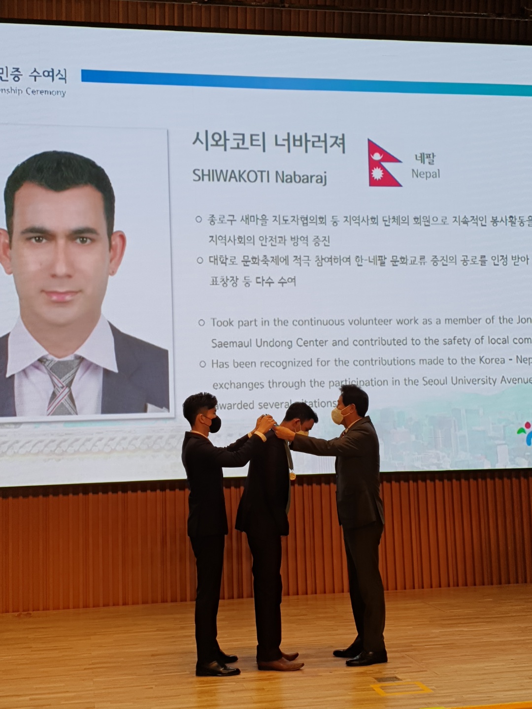 सउल, दक्षिण कोरिया – दक्षिण कोरियाले नेपाली नागरिकलाई कोरियाको मानार्थ नागरिकको सम्मान प्रदान गरेको छ । मोरङ, विराटनगरका नवराज शिवाकोटीले यही मङ्सिर १५ गते सउल महानगरपालिकाद्वारा आयोजित समारोहबीच कोरियाको मानार्थ नागरिकको सम्मान प्राप्त गर्नुभएको हो ।