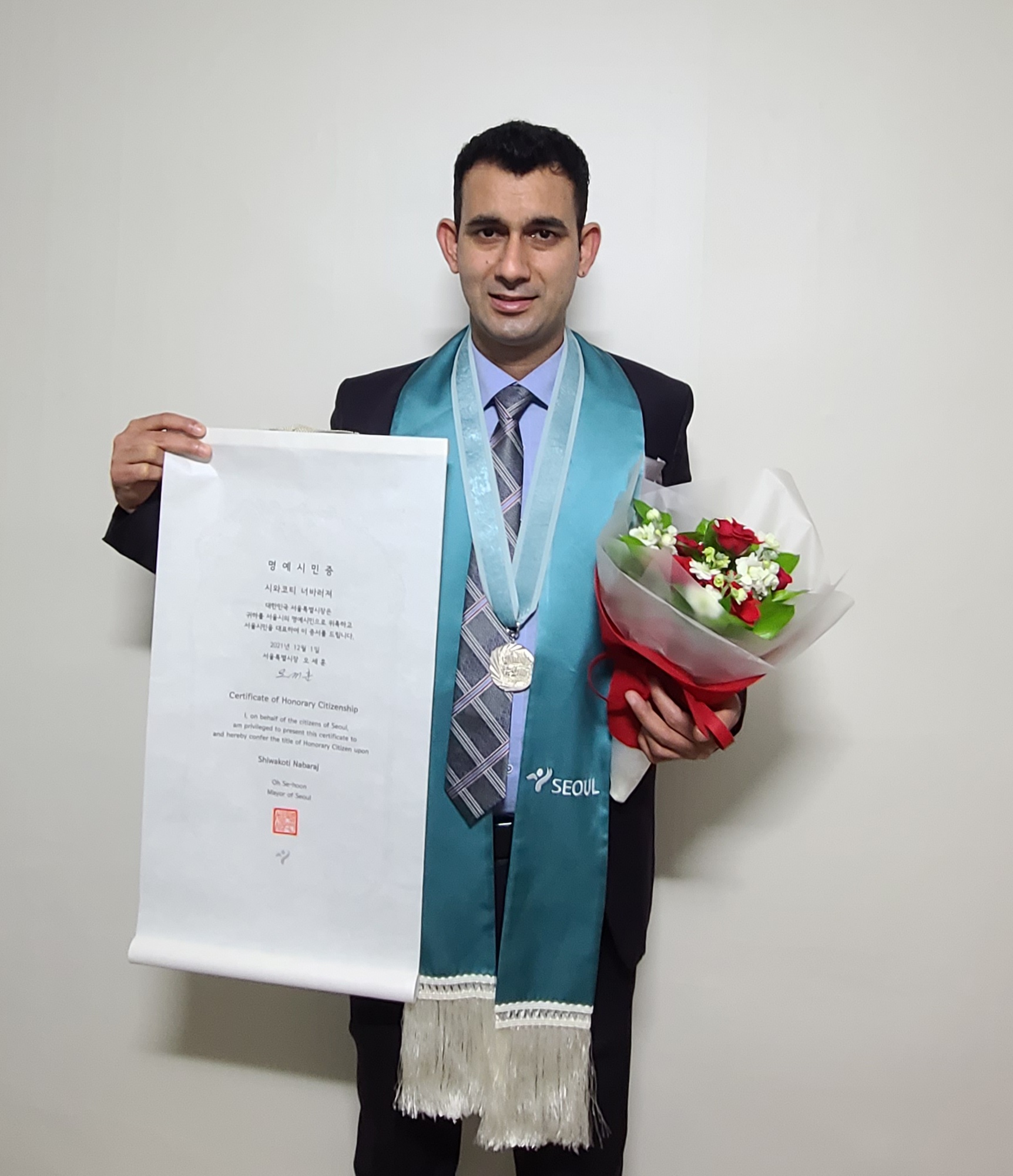 महानगरपालिकाले हरेक वर्ष विदेशीलाई यस्तो सम्मान दिन्छ । दक्षिण कोरिया सरकारले नेपाल र कोरियाको सांस्कृतिक, आर्थिक सम्बन्ध निर्माण गर्न पुलको भूमिका निर्वाह गरेवापत उहाँलाई सो सम्मान दिएको हो । उहाँले महानगरपालिकाका प्रमुख उ सेहुन्बाट सम्मानपत्र, मानार्थ नागरिकताको प्रमाणपत्र र एक रजत पदक प्राप्त गर्नुभयो ।