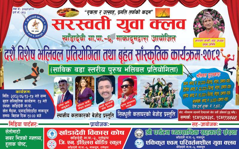 रामेछाप – सरस्वती युवा क्लब रामेछापले बडादशैँ २०८२ सालको अवरसर पारेर भलिबल प्रतियोगिता तथा बृहद सांस्कृतिक कार्यक्रम गर्ने भएको छ । खाँडादवी गाउँ पालिकाको कार्यालय घ्याङसिङडाँडामा बडादशैँ फूलपाती, महाअष्टमी र महानवमी गरी तीन दिन उक्त कार्यक्रम हुने संस्थाका अध्यक्ष रवि खत्रीले बताए ।